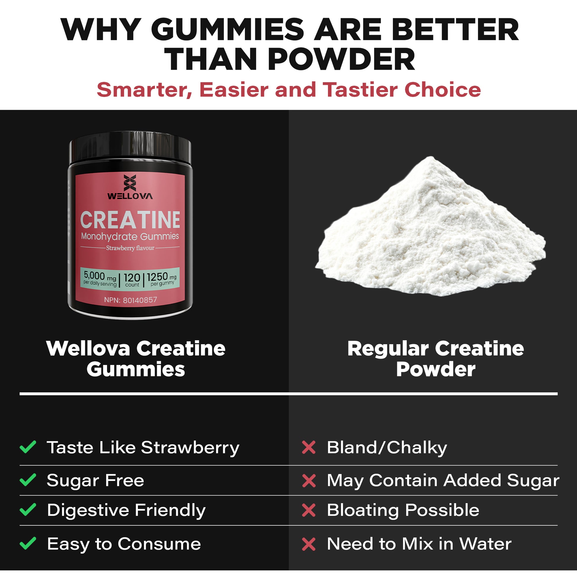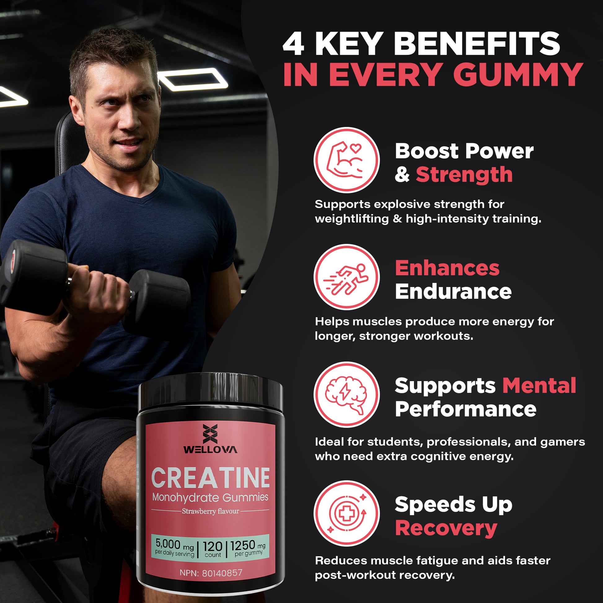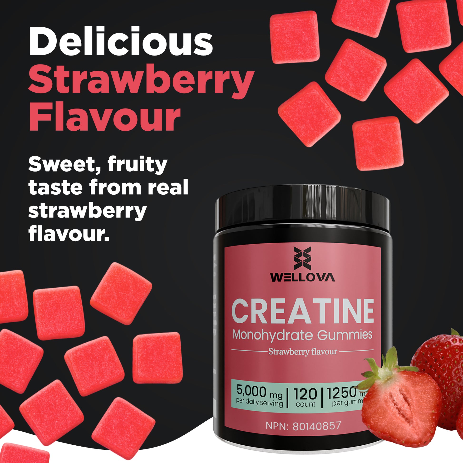 Wellova Creatine Monohydrate Gummies | Strawberry Flavour | 120 Count | 5,000 mg Daily Serving | 1,250 mg per Gummy | Canadian Made Creatine Supplement