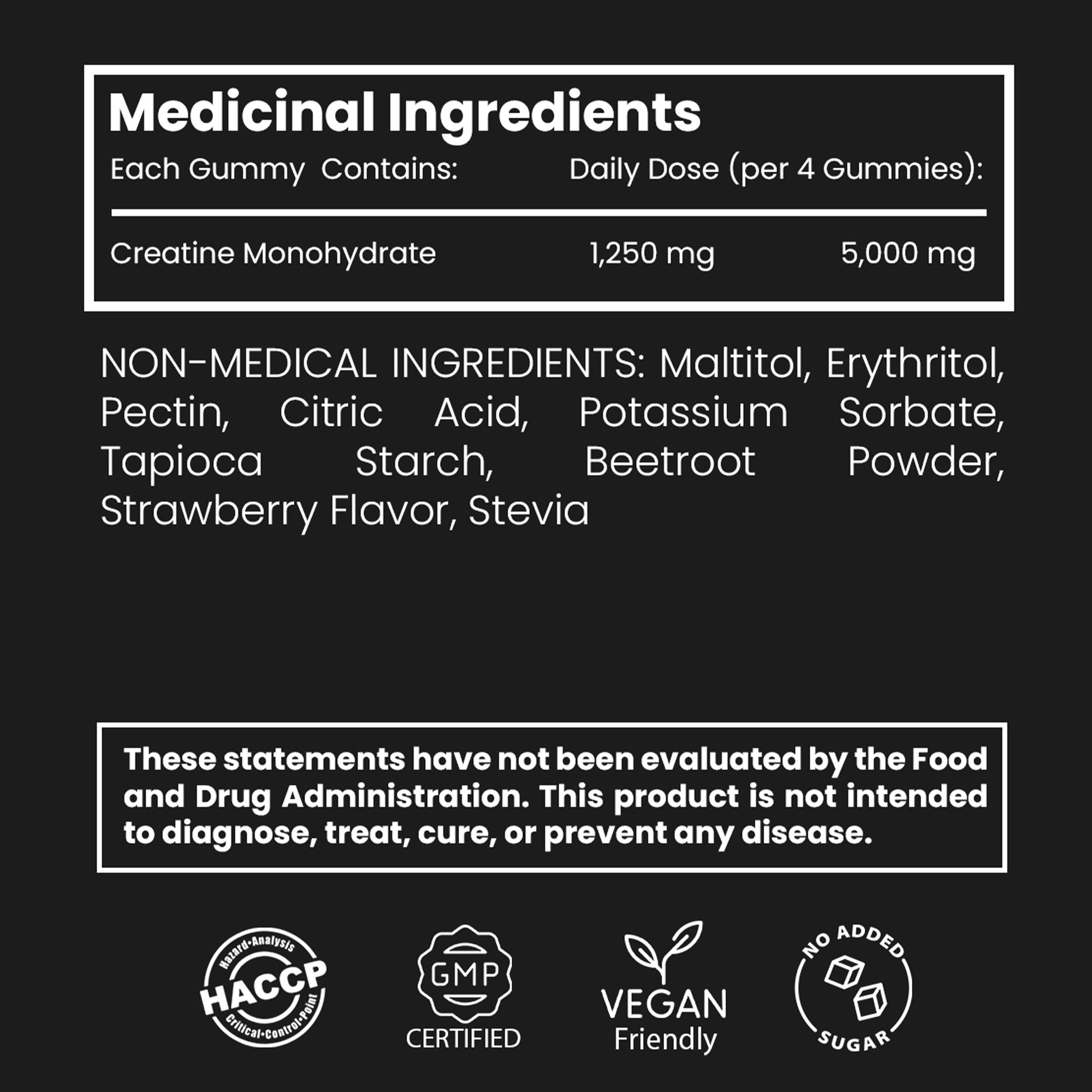 • 1,250 mg of Creatine Per Gummy – A delicious and convenient way to take creatine. No mixing, no powder—just chew and enjoy!