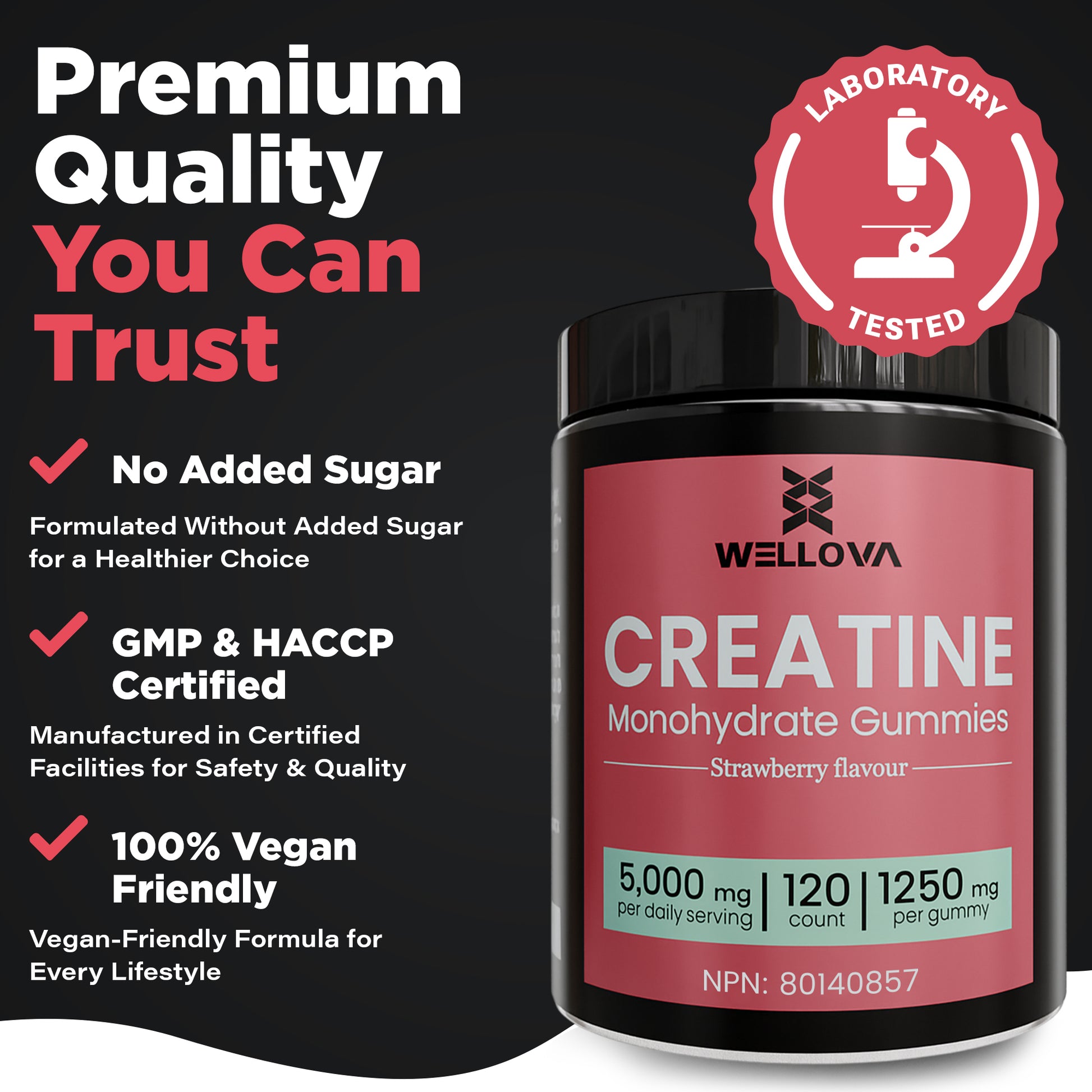 Wellova Creatine Gummies are NPN certified (80140857) and proudly manufactured in Canada under strict quality standards. With 120 gummies per bottle, you get long-lasting supply, dependable dosing, and delicious flavour that makes daily creatine easy to stick to.