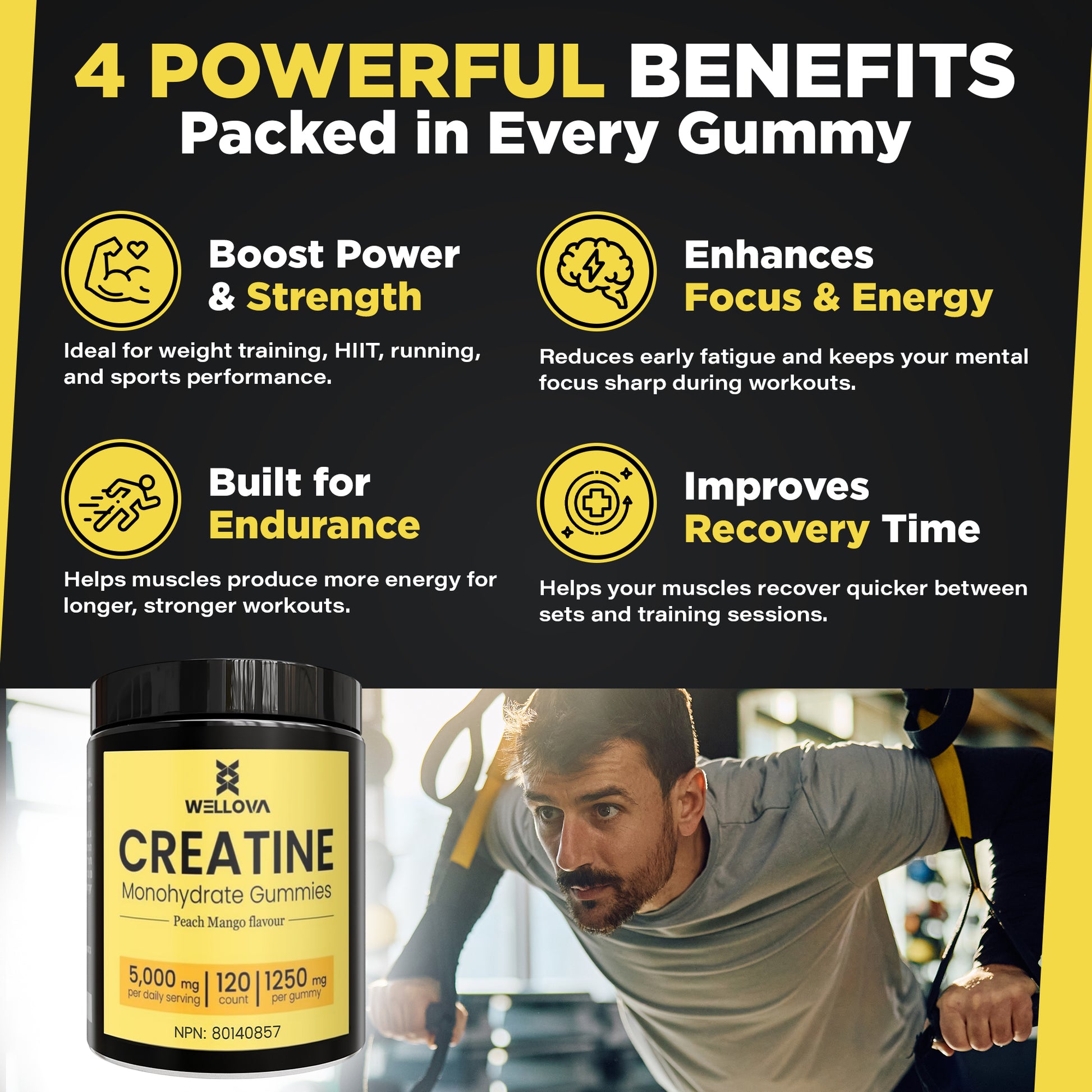 Wellova Creatine Monohydrate Gummies | Peach Mango Flavour | 120 Count | 5,000 mg Daily Serving | 1,250 mg per Gummy | Canadian Made Creatine Supplement