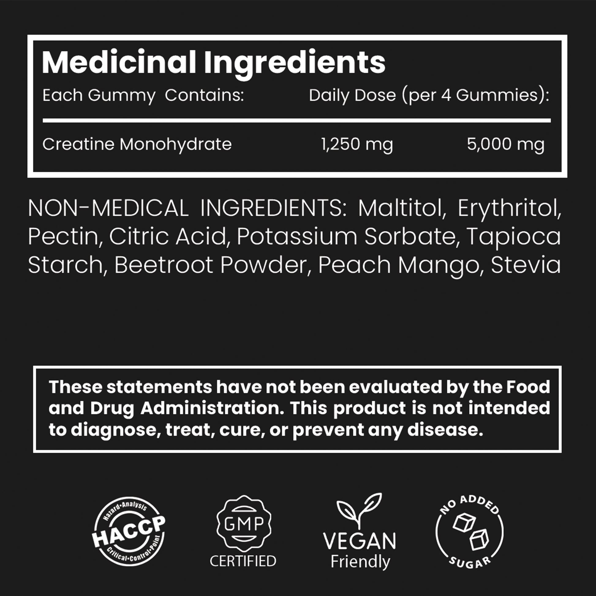 • Convenient 1,250 mg Gummies – Enjoy creatine in a delicious peach mango gummy format. No mixing, no powder, no mess—just chew and go.
