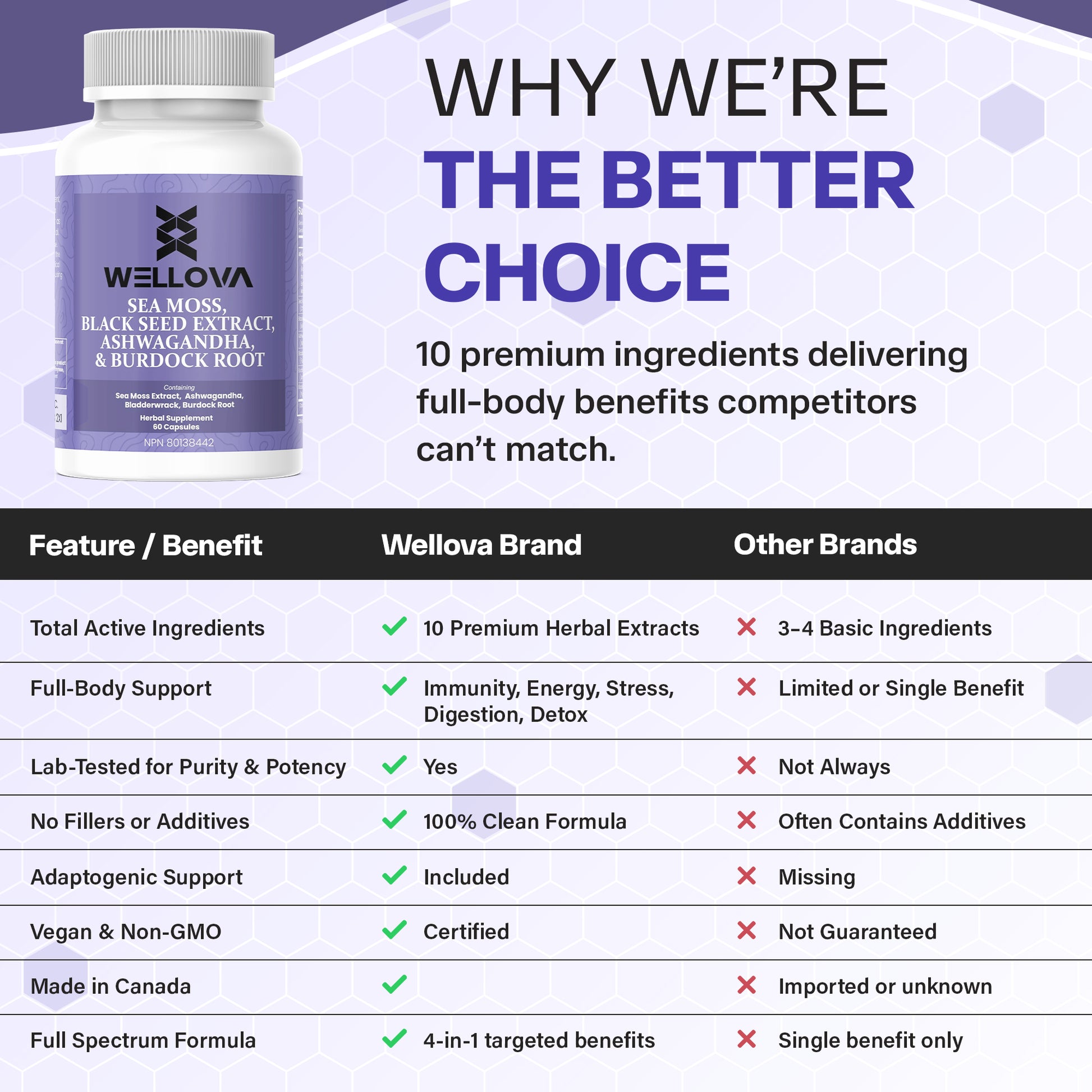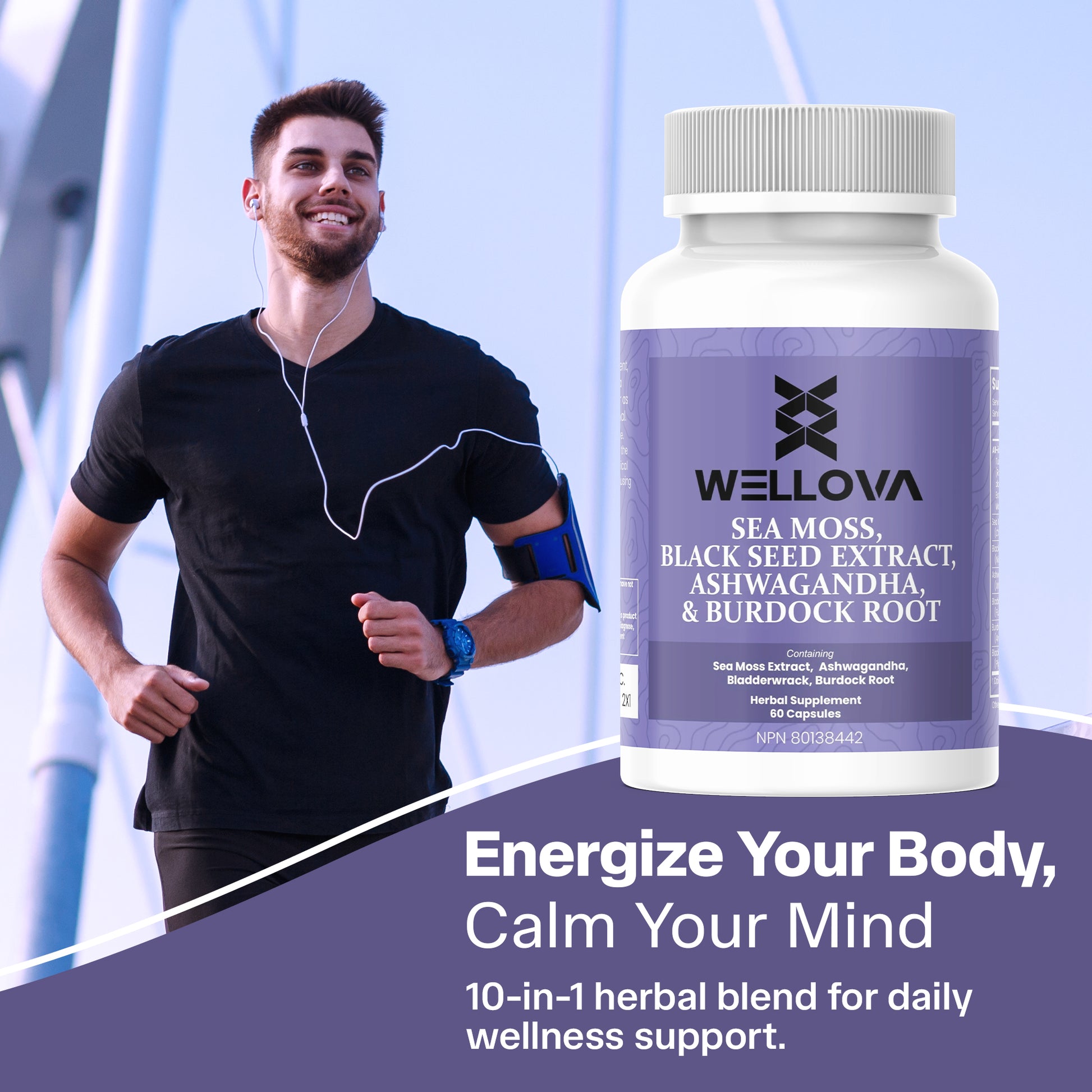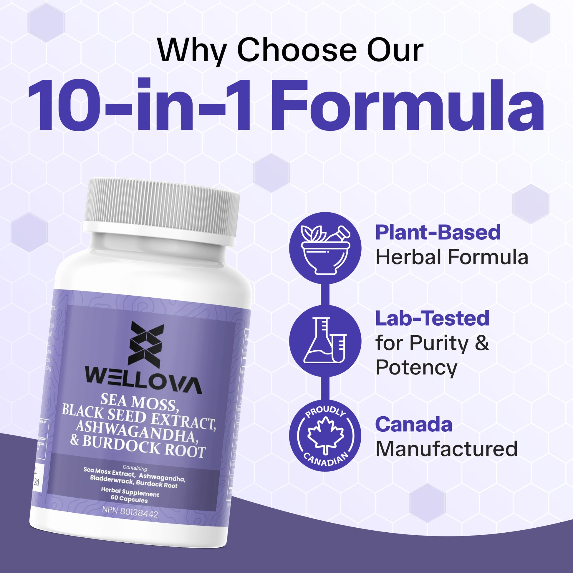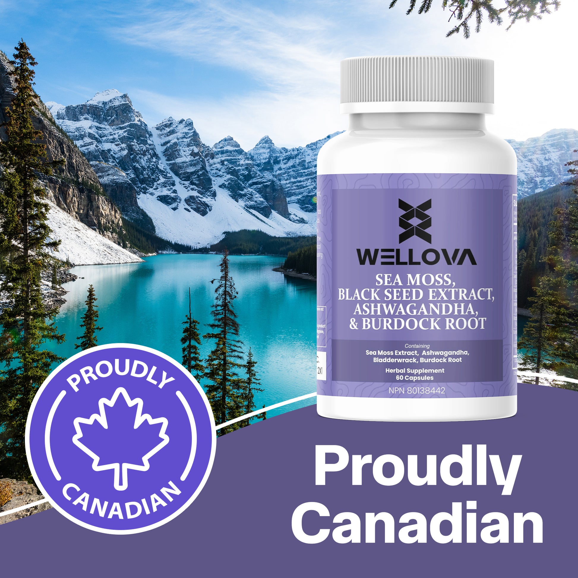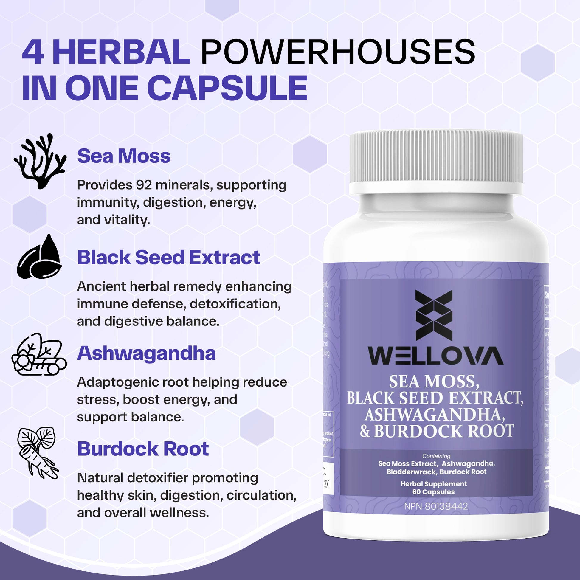 Wellova Sea Moss, Black Seed Extract, Ashwagandha & Burdock Root | Herbal Blend with Bladderwrack | 60 Capsules | Canadian Made | Natural Wellness Supplement